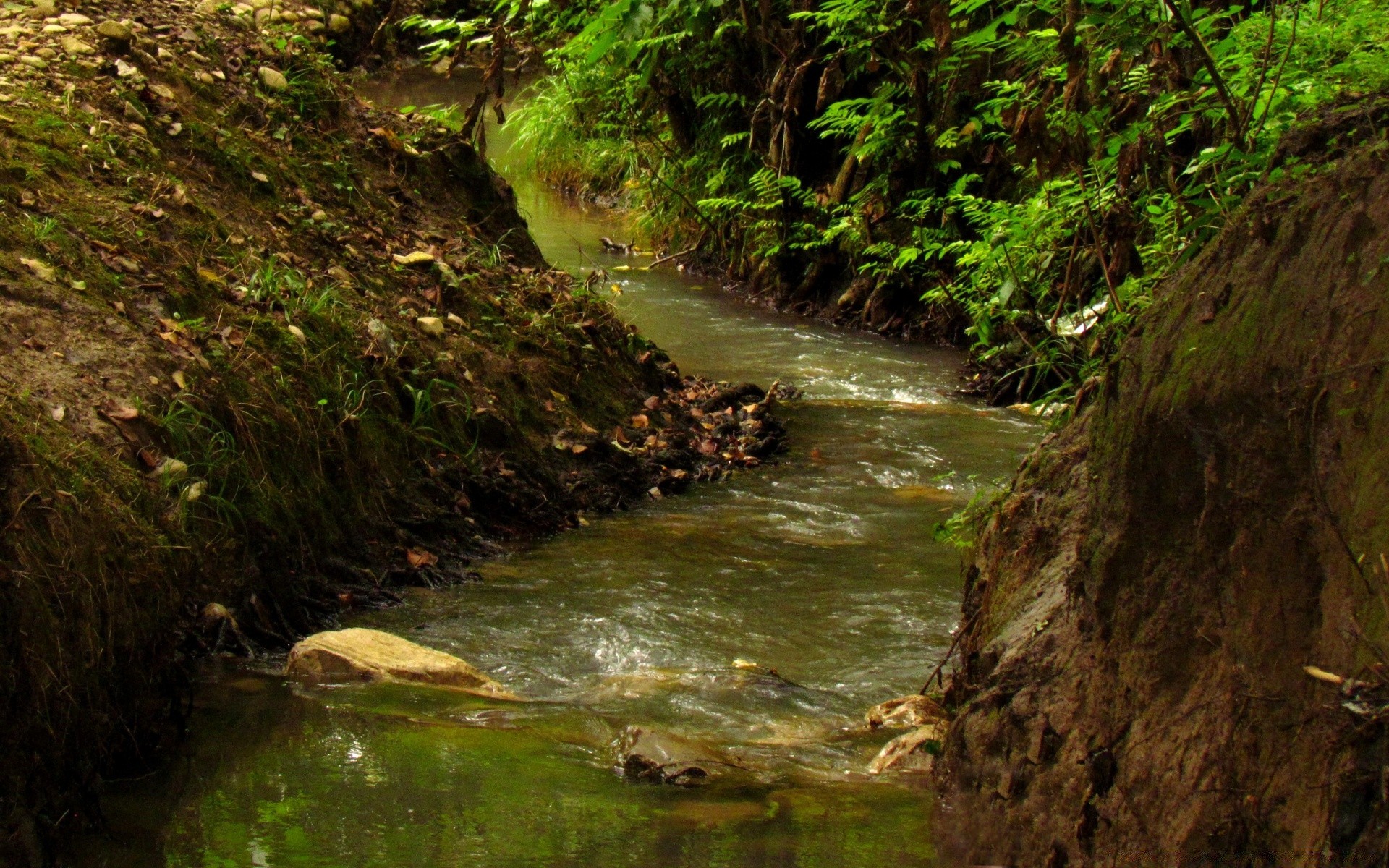 Fiume nella foresta con foglie