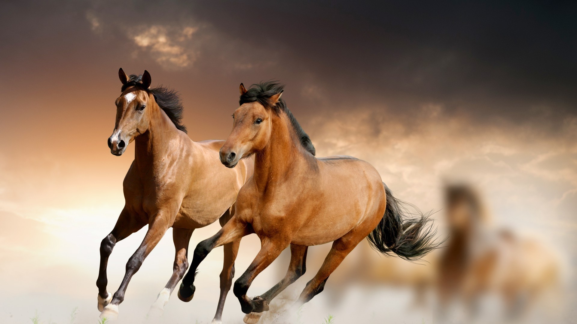 Una coppia di cavalli corre attraverso il campo al tramonto