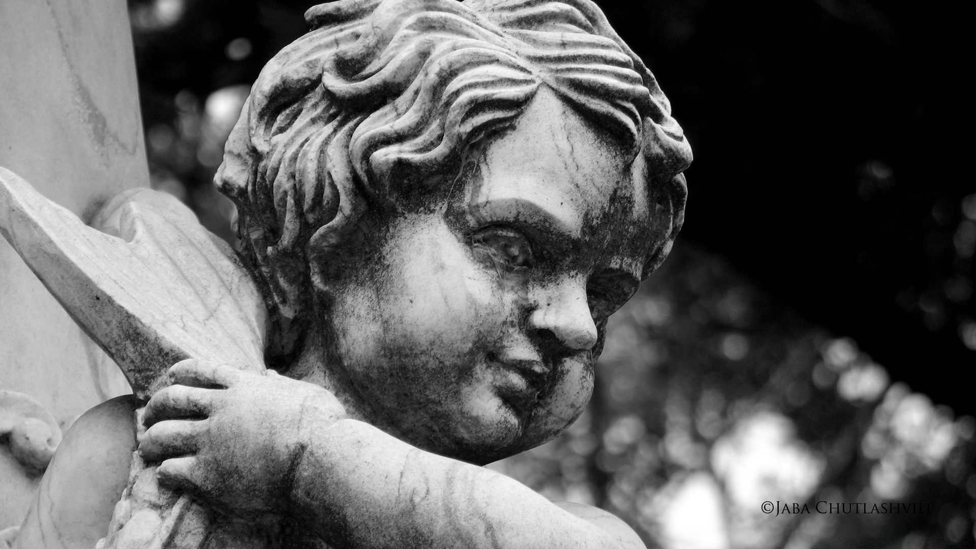Il volto di un angelo su uno sfondo di pietra bianca e nera