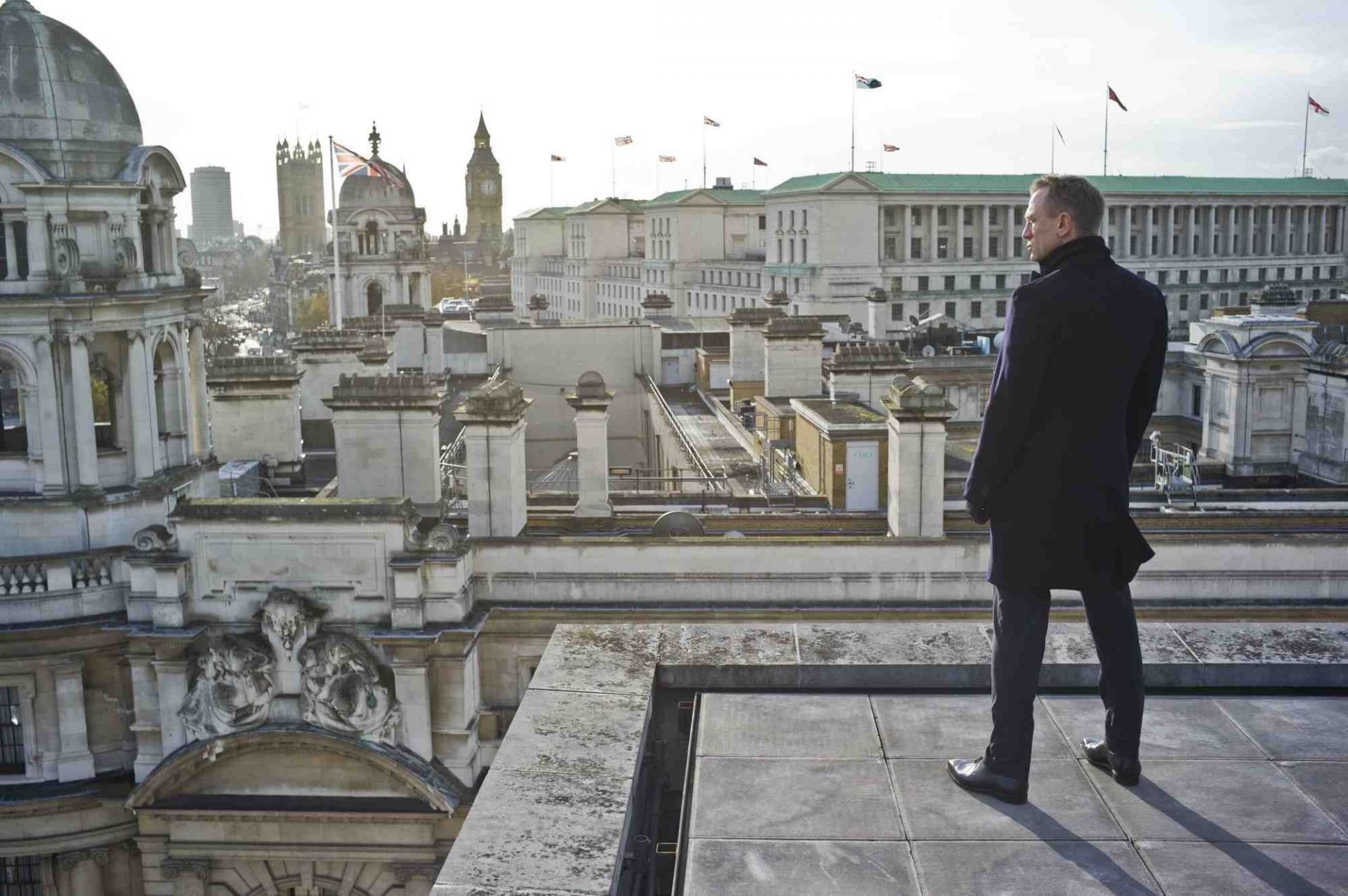 Uomo sullo sfondo di una città grigia