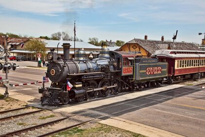 Una locomotiva a vapore viaggia lungo i binari della ferroviaUna locomotiva a vapore viaggia lungo i binari della ferrovia