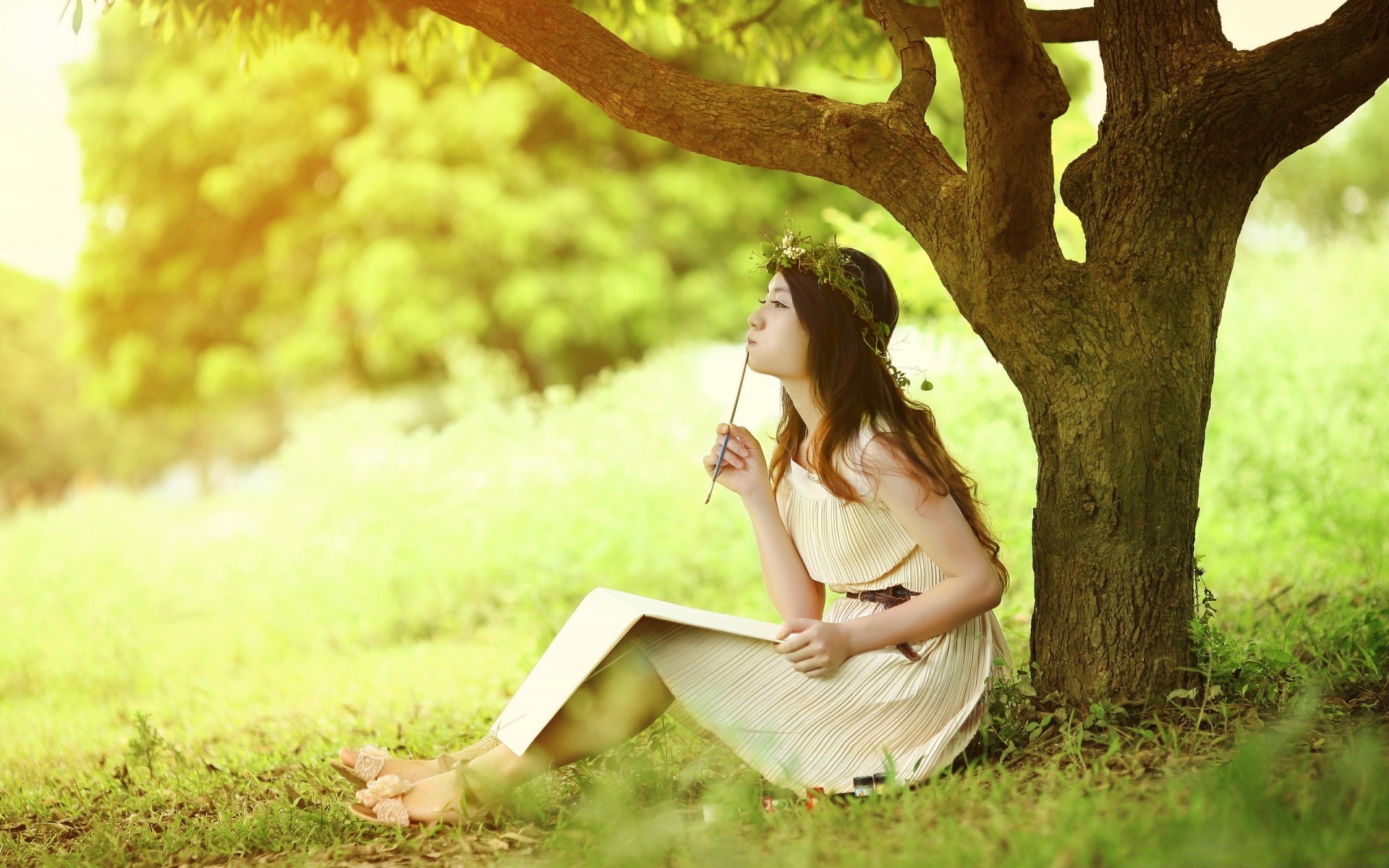 Una ragazza nel giardino sotto un albero scrive un libro di memorie