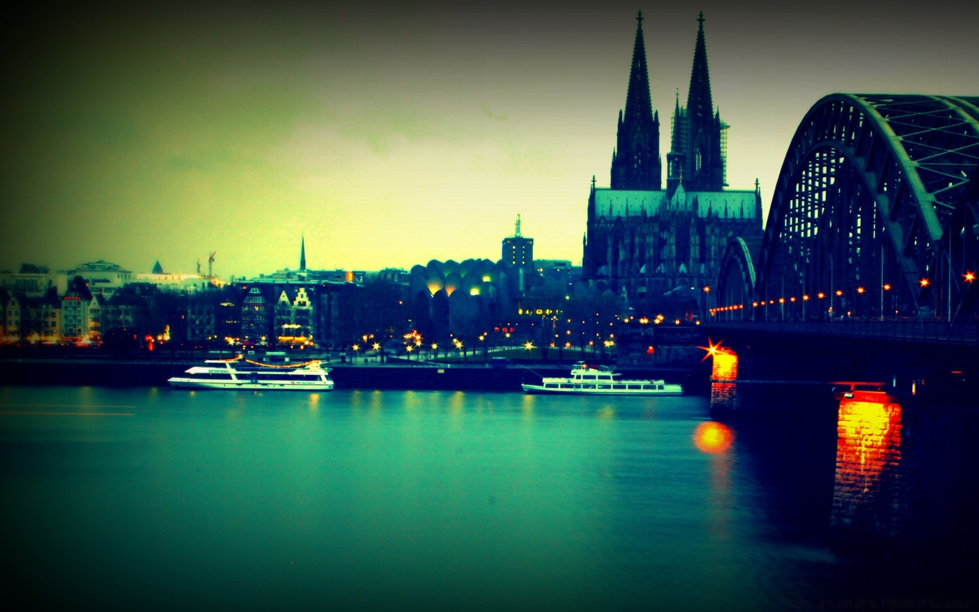 Paesaggio urbano con fiume in insolita gamma verdastra
