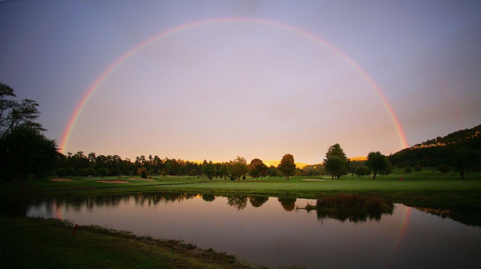 Ponte metallico a forma di arco sullo sfondo delle cime delle montagne