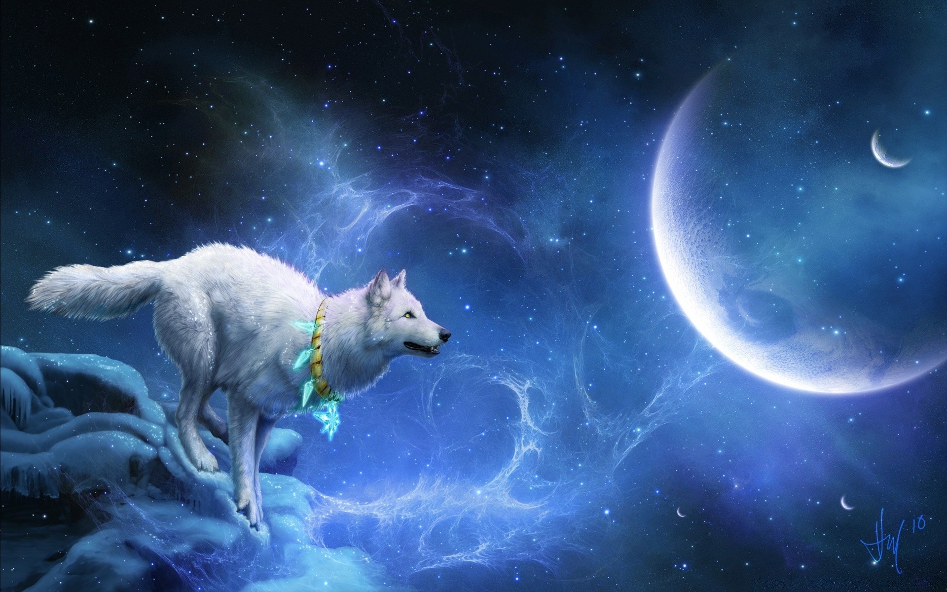 Lupo bianco e Luna su uno sfondo cosmico in stile fantasy