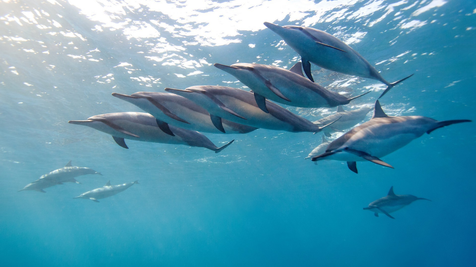 Delfini che giocano nell'acqua trasparente dell'oceano