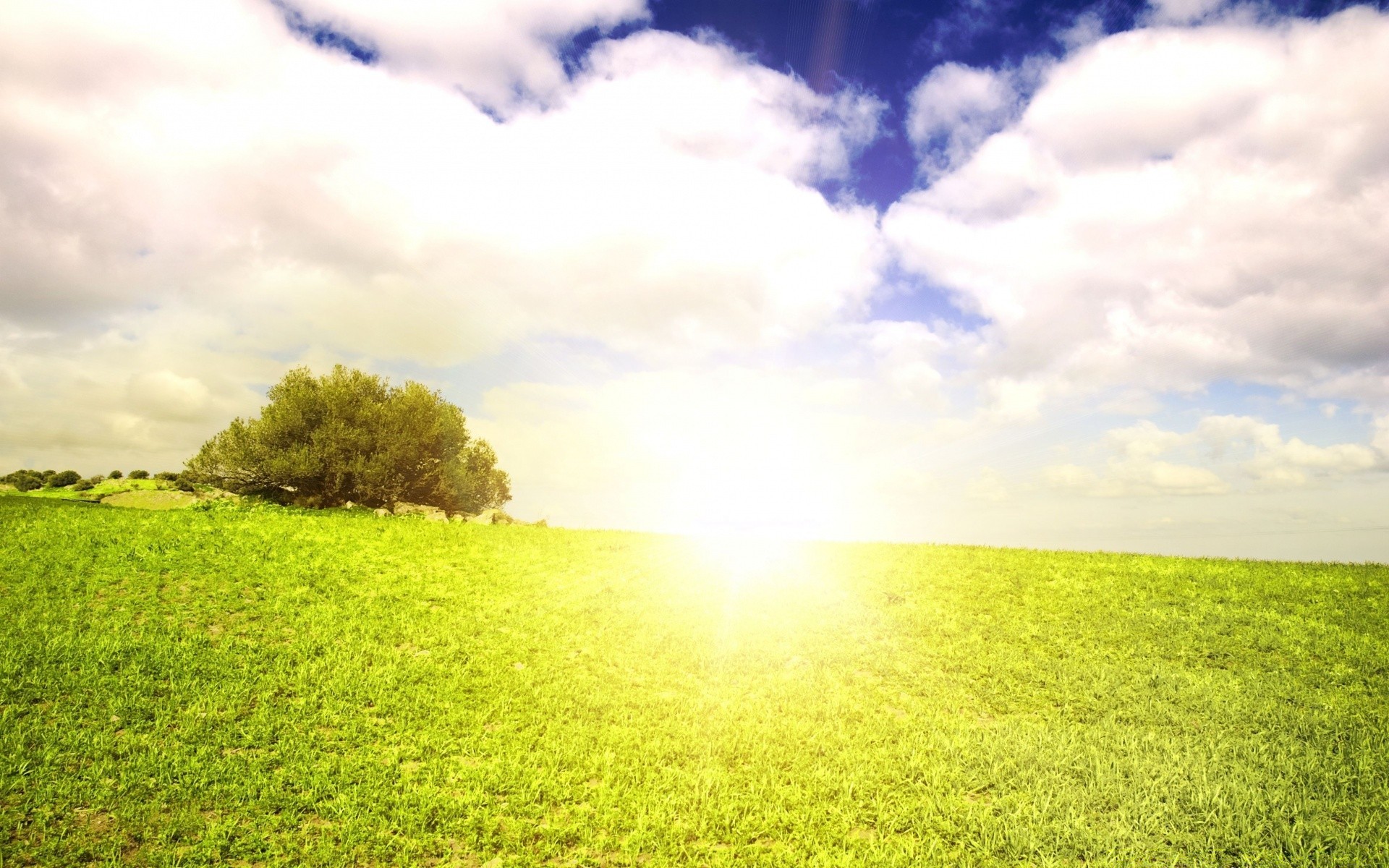 Campo estivo verde e bianco come la neve nuvole sul cielo bluCampo estivo verde e bianco come la neve nuvole sul cielo blu