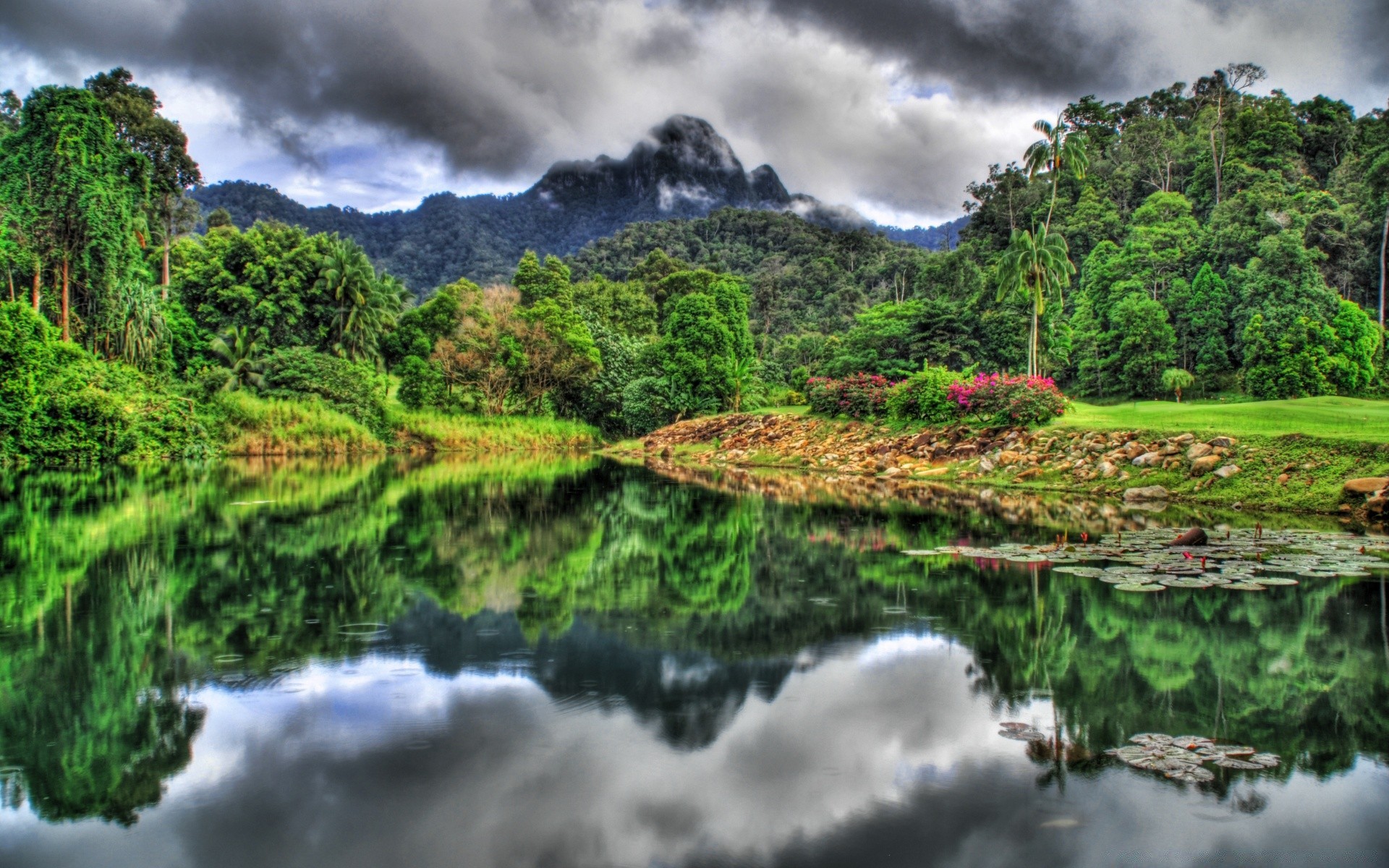 Riflessione di nuvole, cime montuose e alberi nella superficie del lago in una giornata senza vento