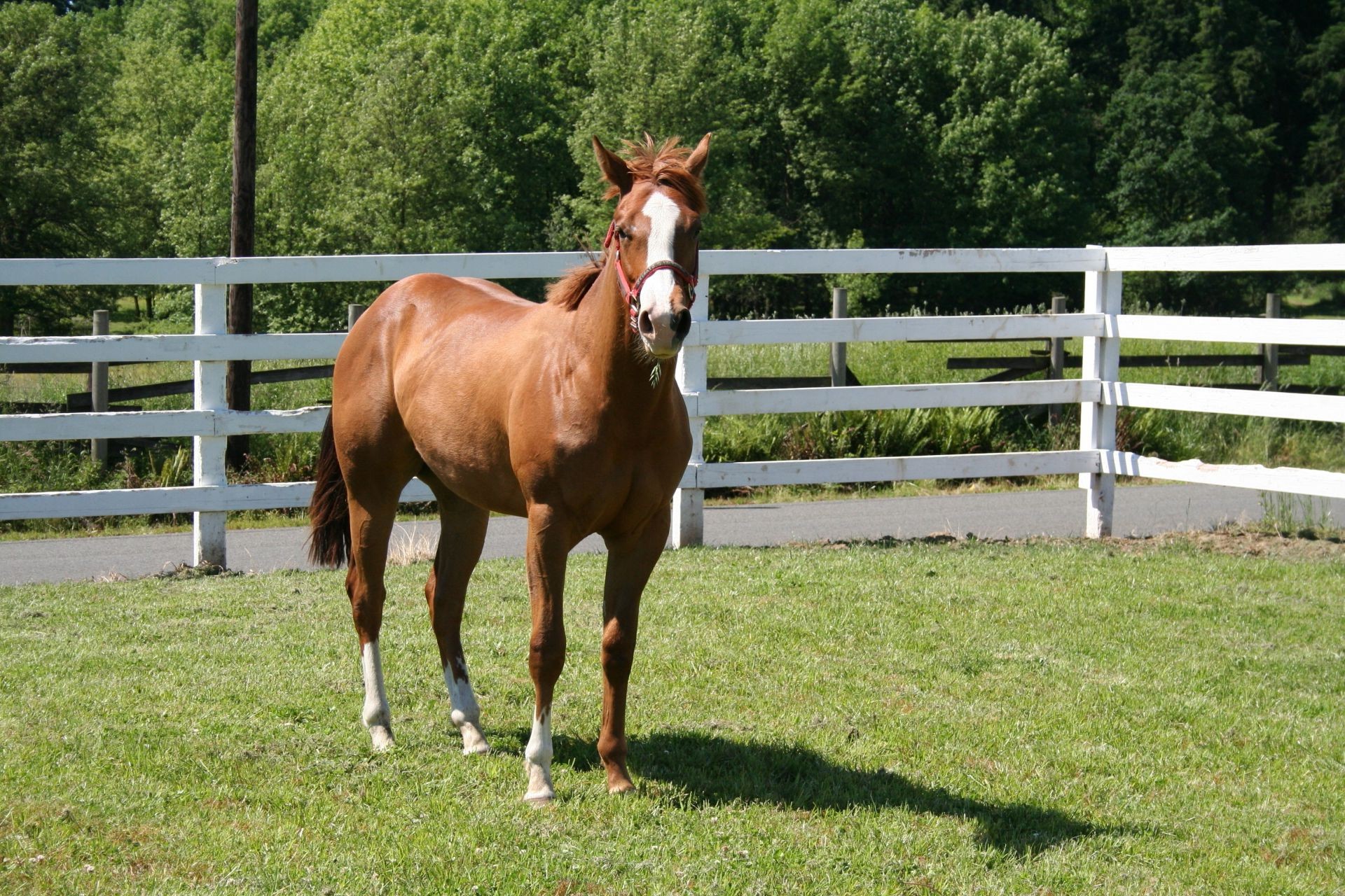 Un cavallo rosso con una macchia bianca sulla testa si trova in un recinto sul prato