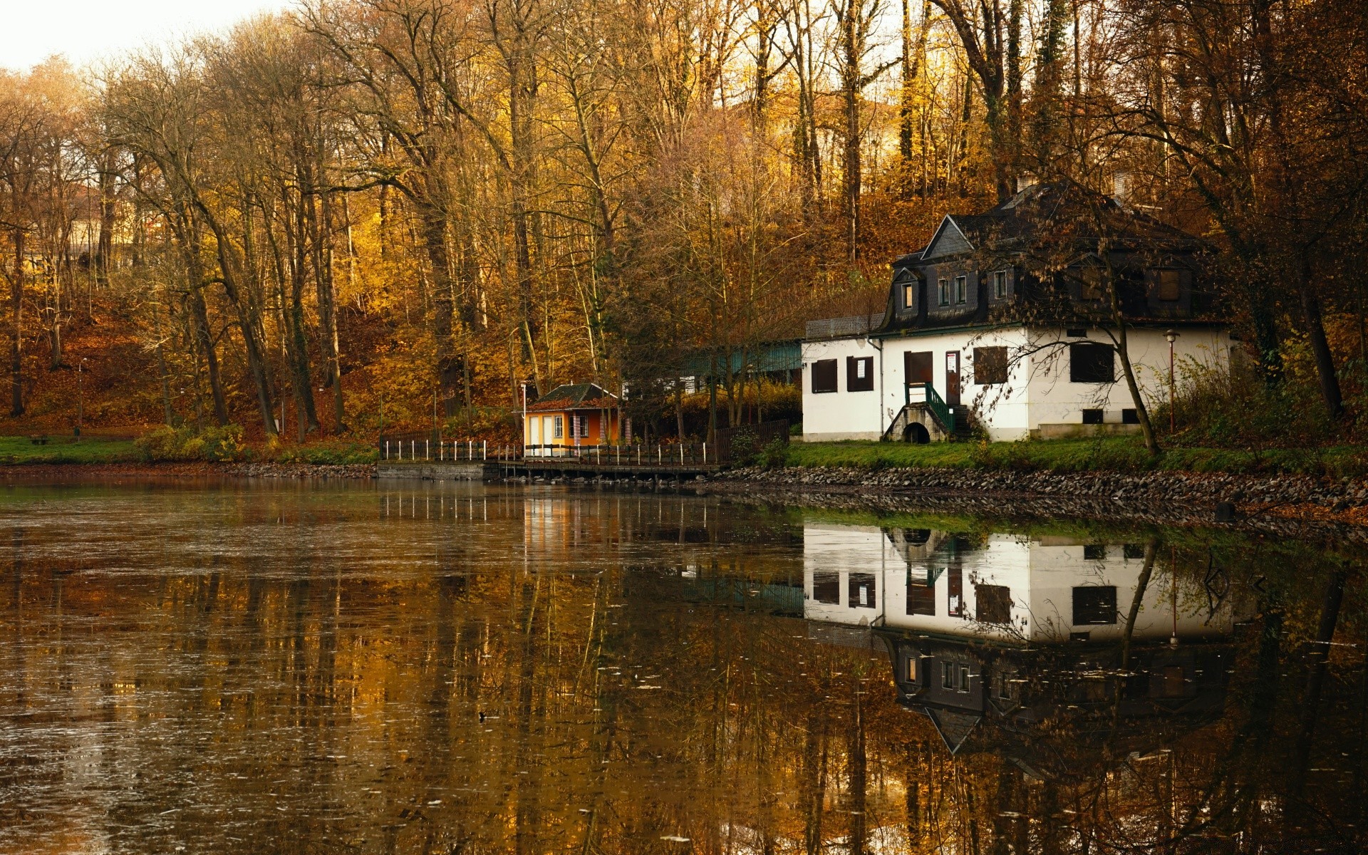 Disegno di una panchina bianca su sfondo giallo sotto gli alberi autunnali