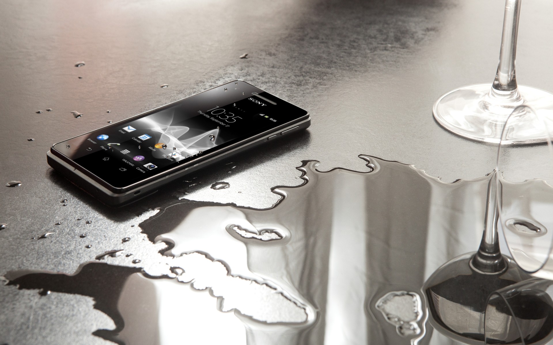 Smartphone di Sony vicino all'acqua versata sullo scrittorio