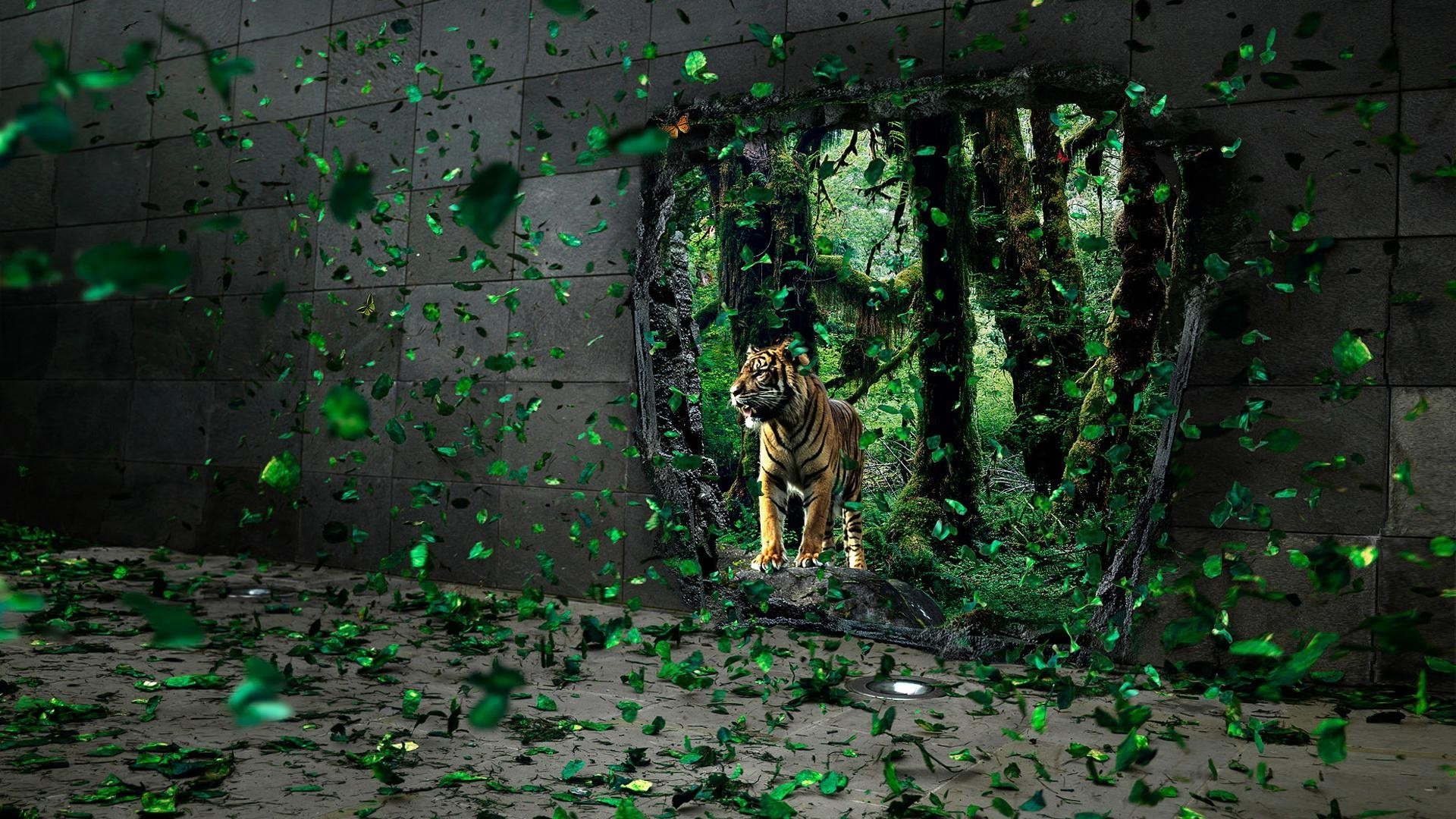 Illustrazione d'epoca di una foto di una tigre e un lupo