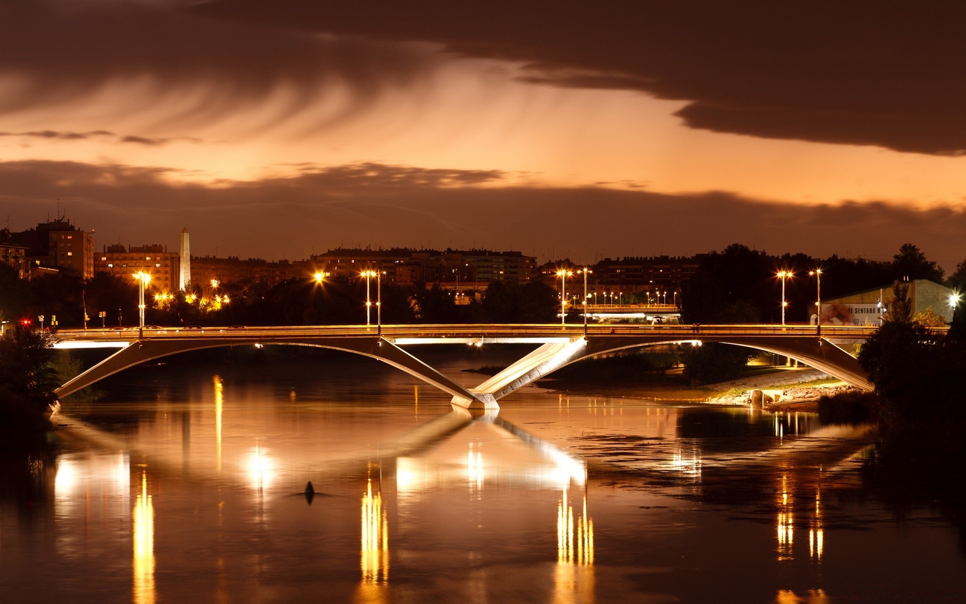 Bella vista sulla città europea. Ponte illuminato sul fiume