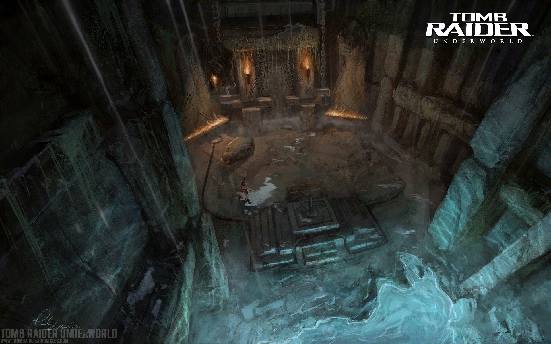Grotta oscura. Due torce sul muro