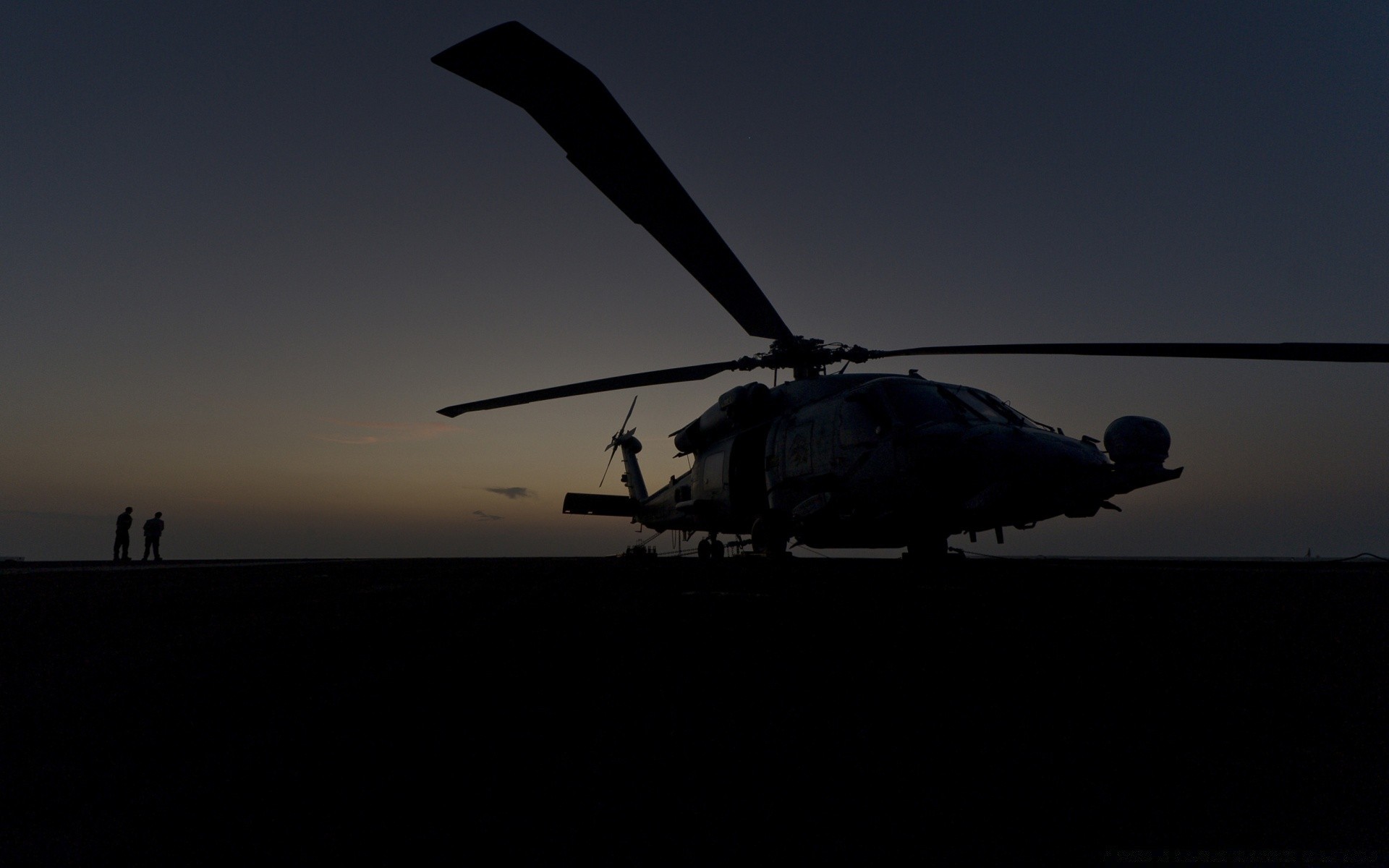 Elicottero addormentato, auto a terra, paesaggio notturno