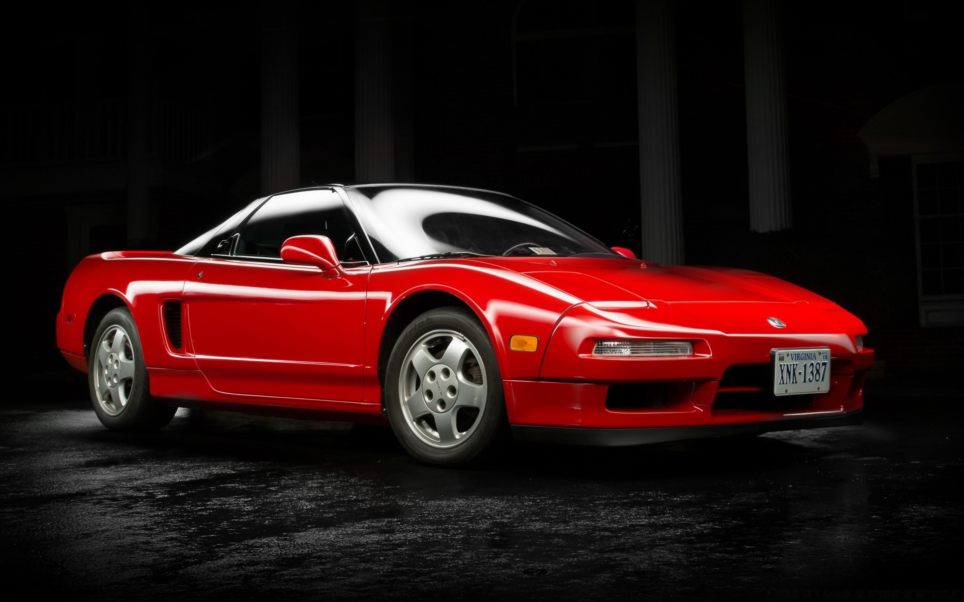 Auto sportiva rossa in mezzo a una strada stretta contro gli alberi autunnali
