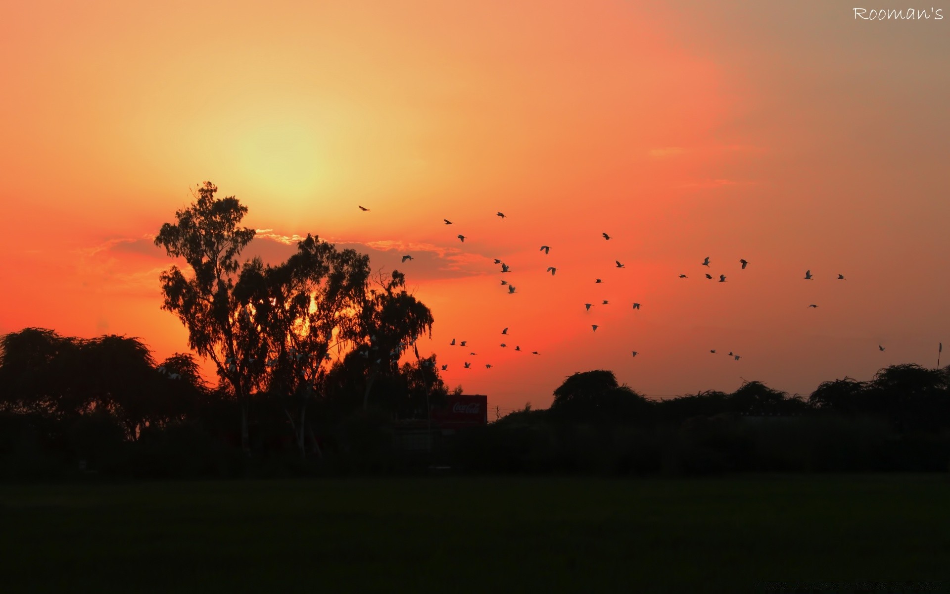 Paesaggio naturale con uno stormo di uccelli sullo sfondo del tramonto