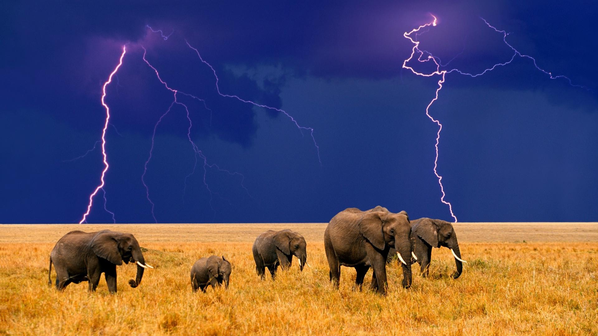 Una famiglia di elefanti nella savana durante un temporale in avvicinamentoUna famiglia di elefanti nella savana durante un temporale in avvicinamento