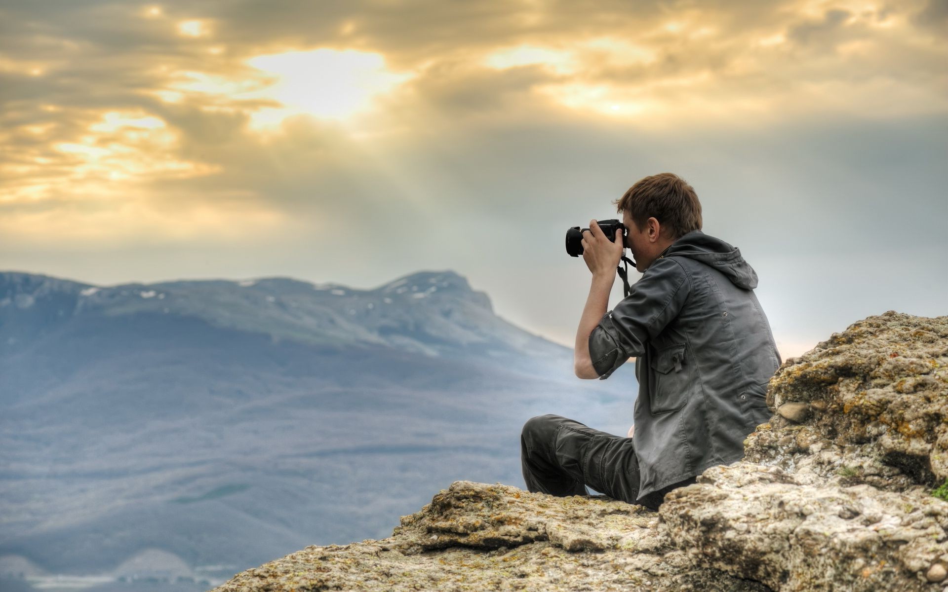 Il ragazzo si siede su una roccia e spara alla macchina fotografica i raggi del sole che passano attraverso le nuvole