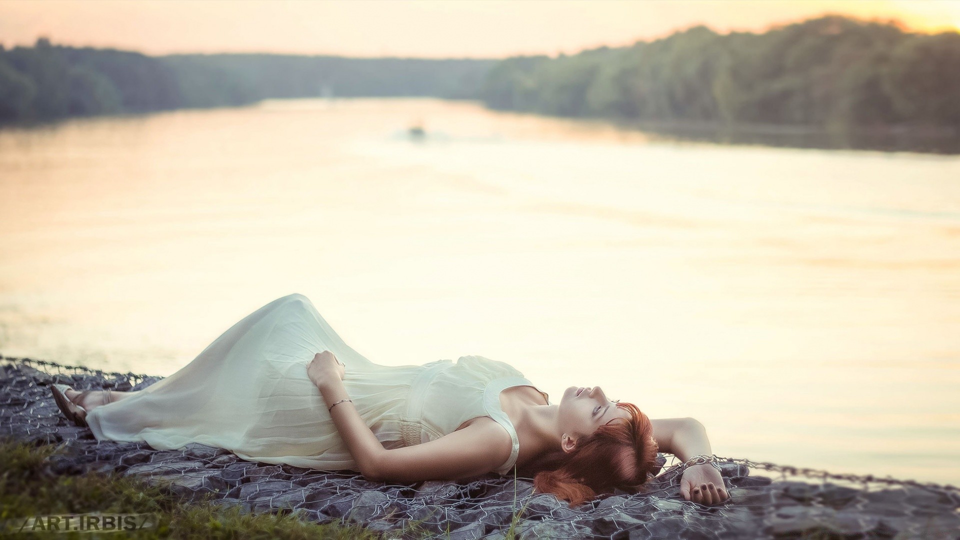 Musicista ragazza si trova in uno stagno poco profondo