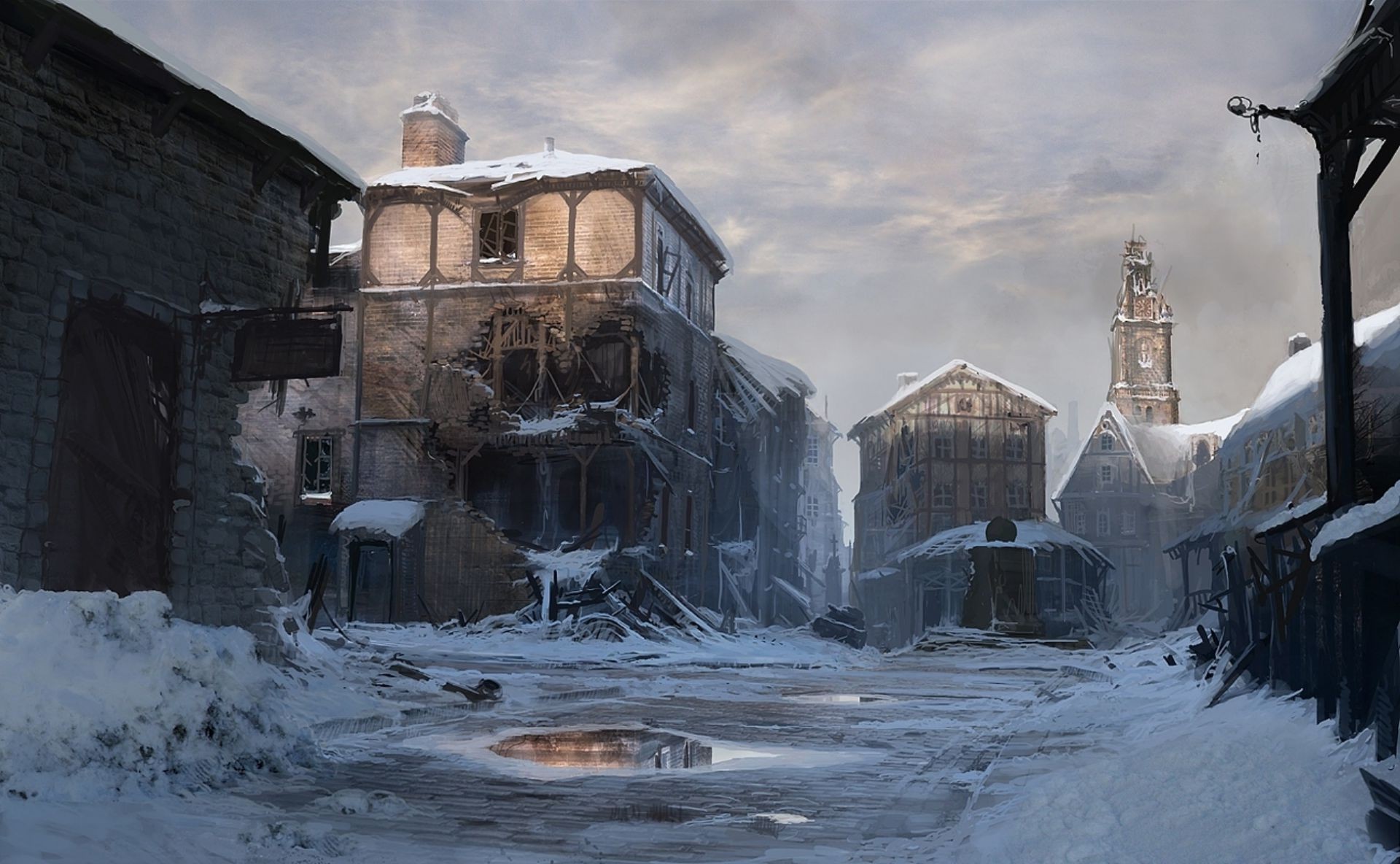 Inverno. La vecchia strada è coperta di neve e ghiaccio