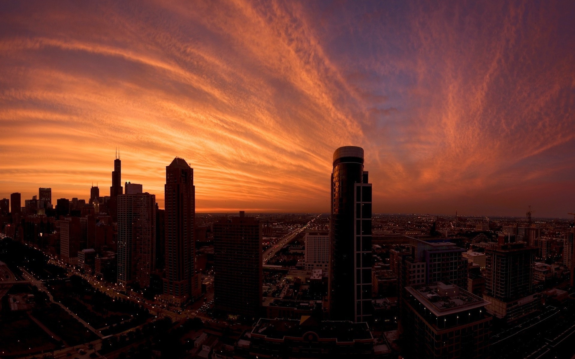Grattacieli sotto il cielo rosso al tramonto