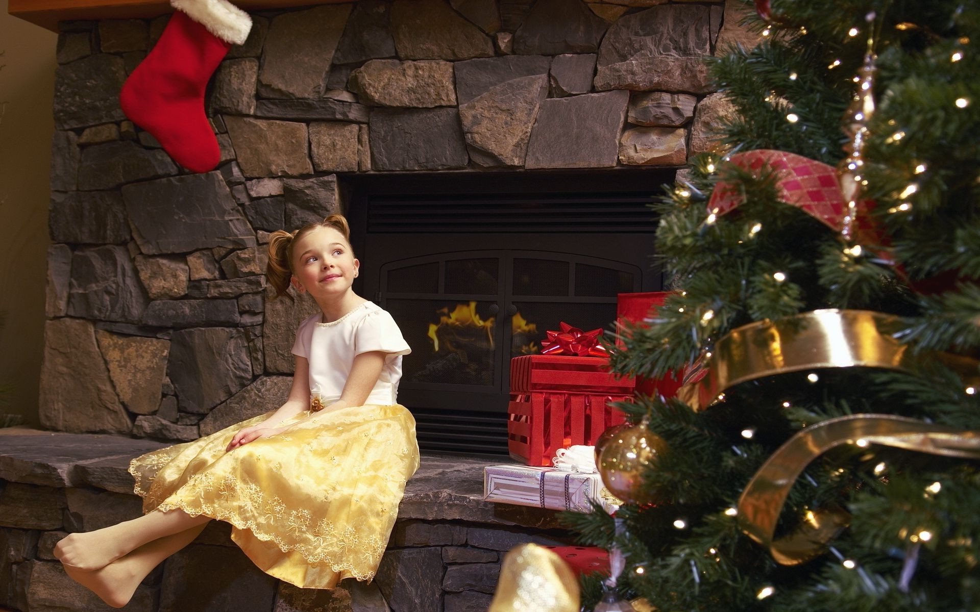 Aspettando un miracolo. Ragazza accanto al camino e albero di Natale vestito. Serpentina