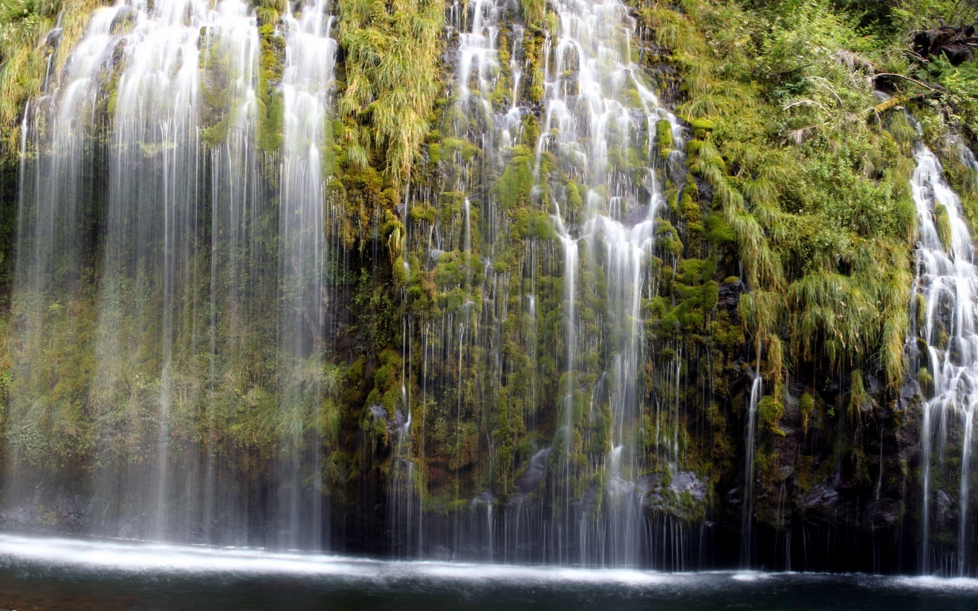 Sottili getti di cascata lavano gli alberi sul fianco della montagnaSottili getti di cascata lavano gli alberi sul fianco della montagna
