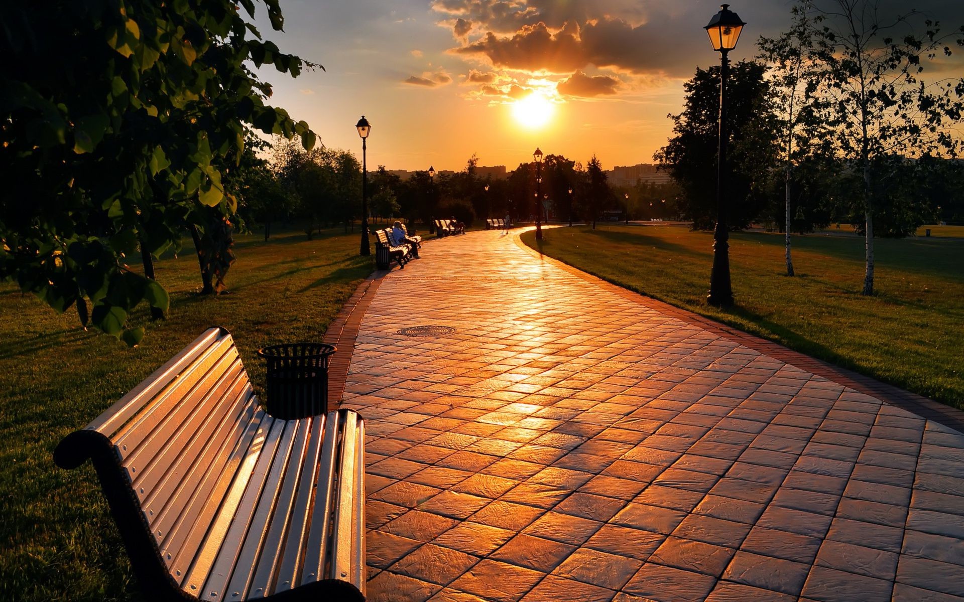 Vicolo notturno con panchine e lanterne