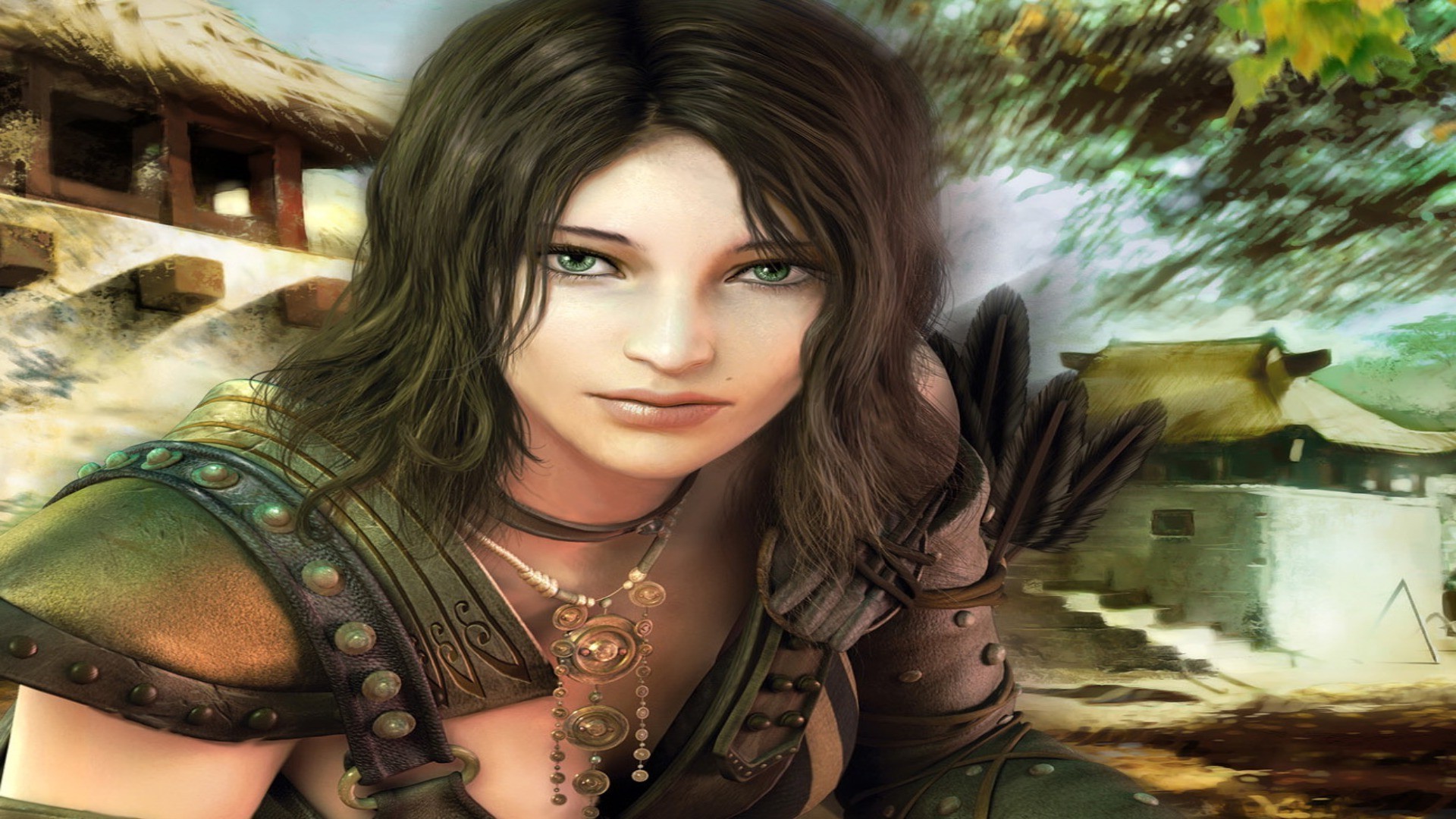 Ritratto di una ragazza guerriera sullo sfondo del villaggioRitratto di una ragazza guerriera sullo sfondo del villaggio