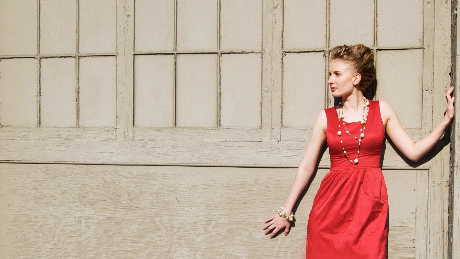 Ragazza in abito rosso contro il muro