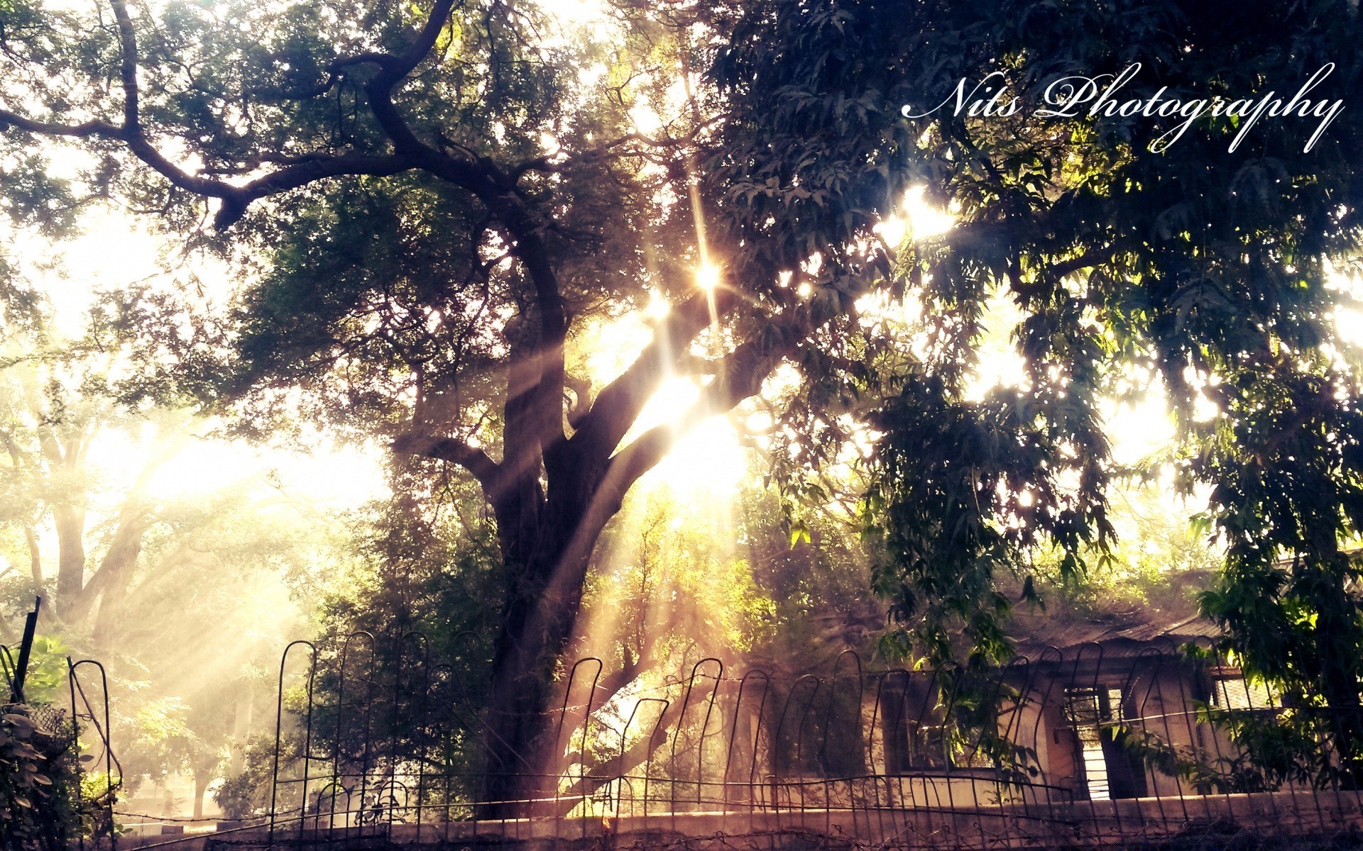 Alberi nella nebbia sullo sfondo del crepuscolo