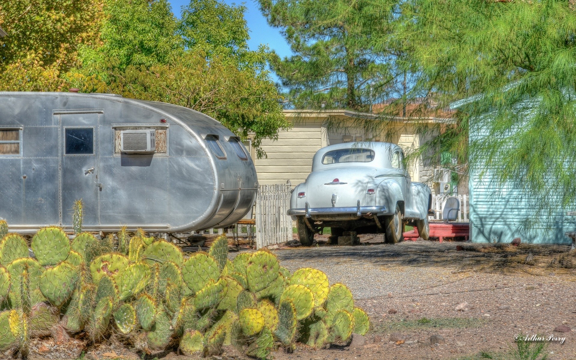 Cactus, vecchia macchina, vagone, insegnano la terra