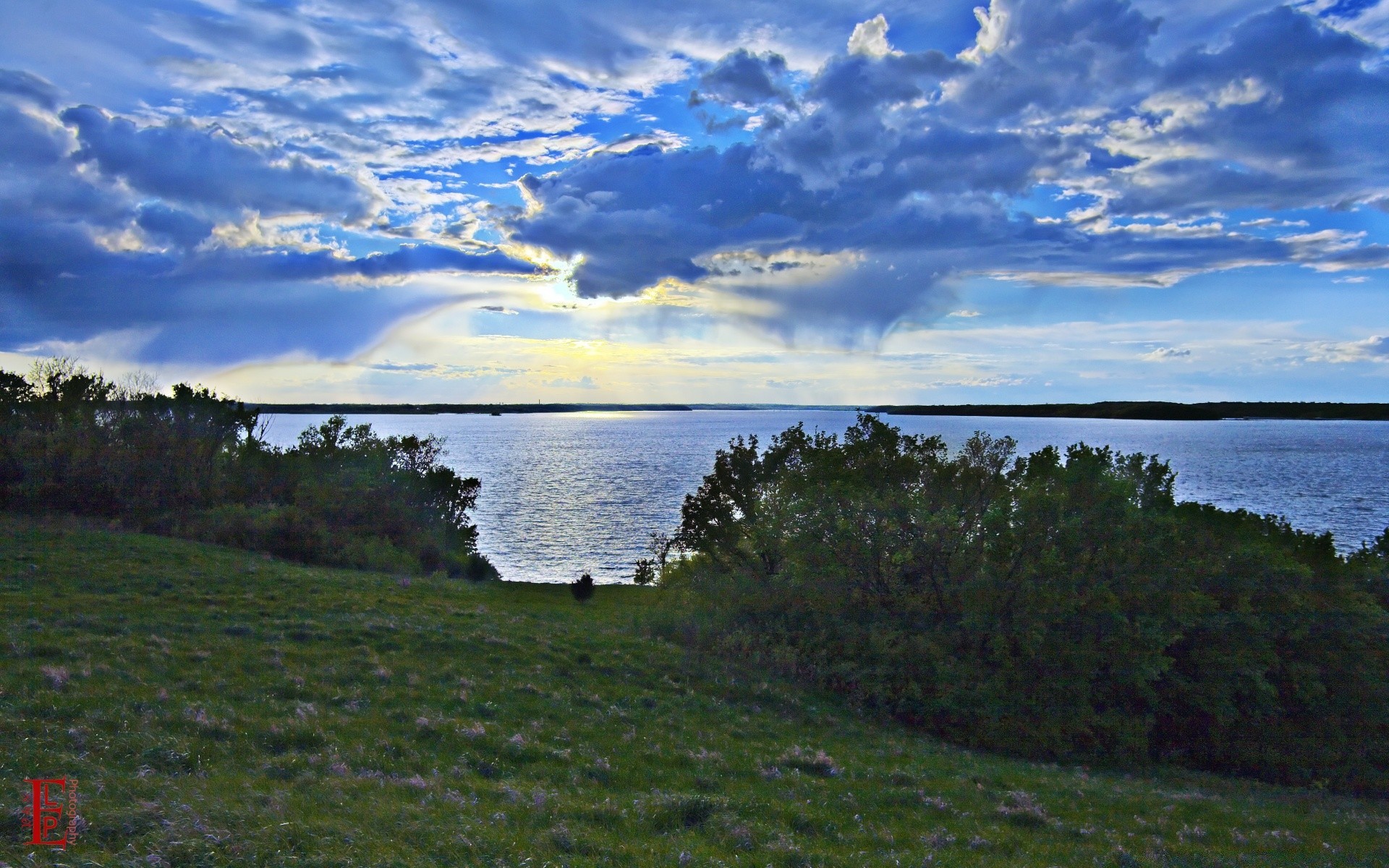 Tramonto tra le nuvole sopra il lago vista dalla collina