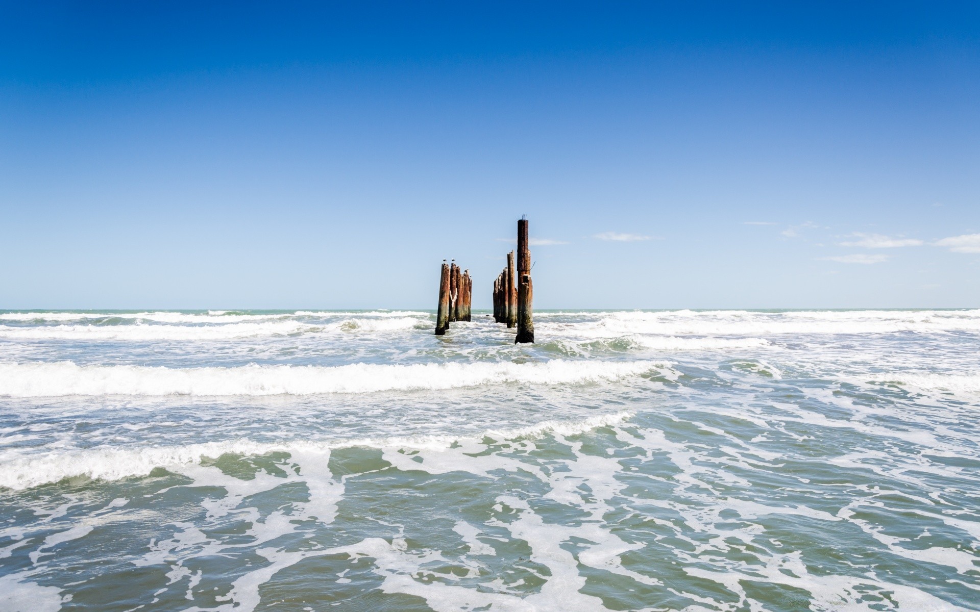 L'acqua di mare infuria sulle coste rocciose sotto un cielo nuvoloso