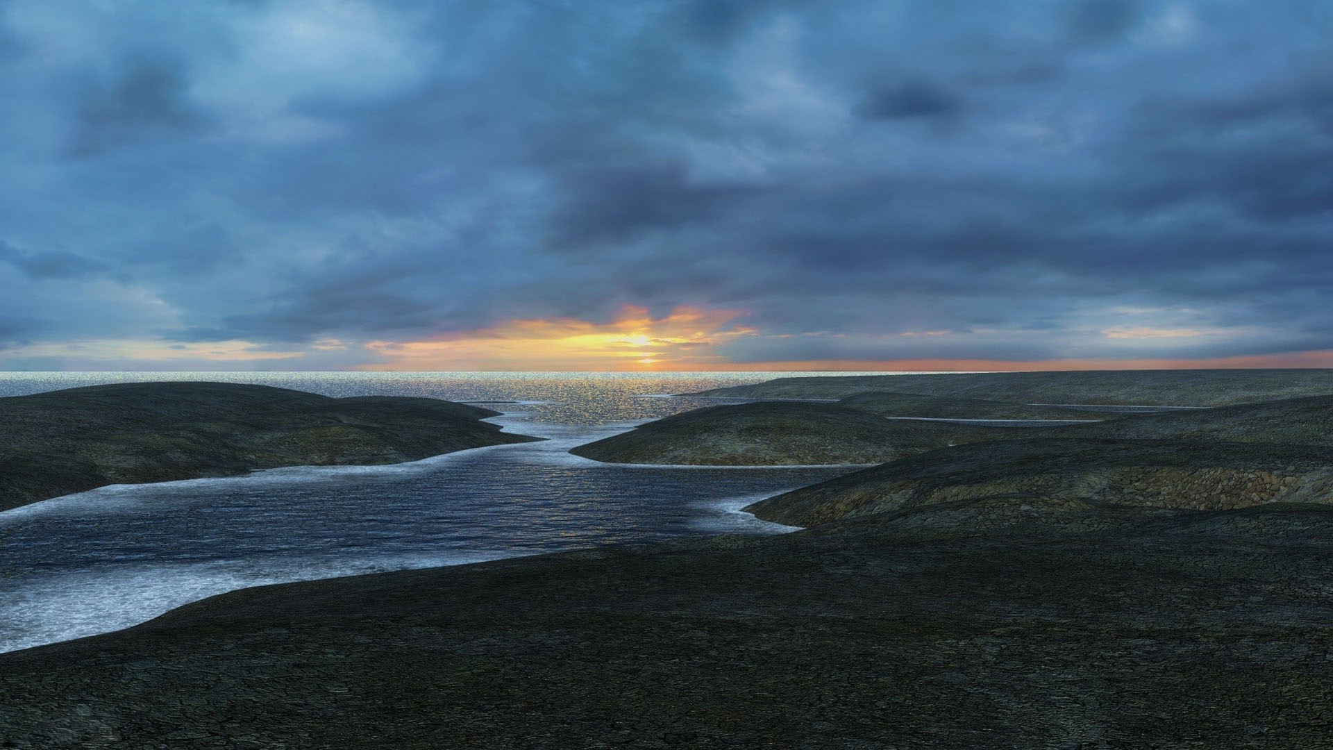 Paesaggio con vista sul tramonto e sull'acqua