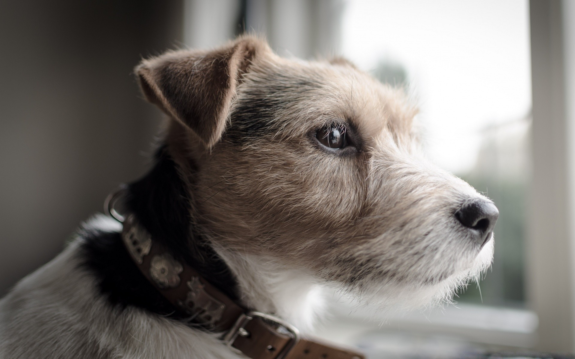Ritratto di un cucciolo che guarda fuori dalla finestra