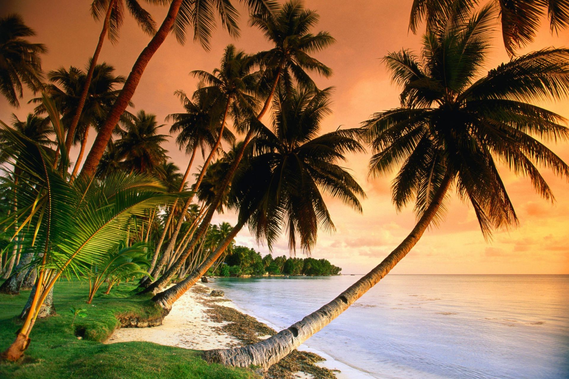 Palme, tramonto, sabbia bianca e mare in colori tenui