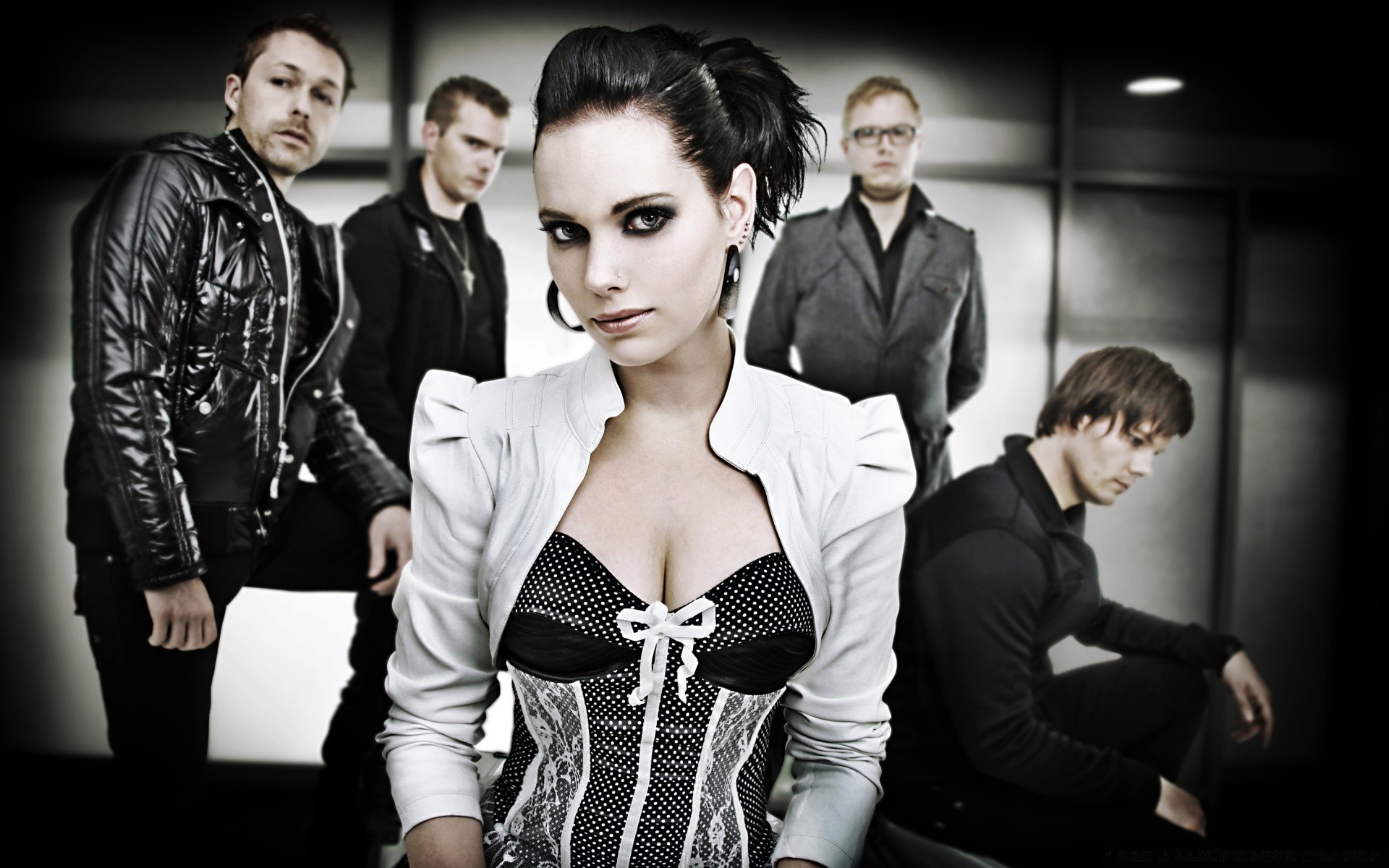 Ragazza in giacca bianca su uno sfondo di quattro uomini