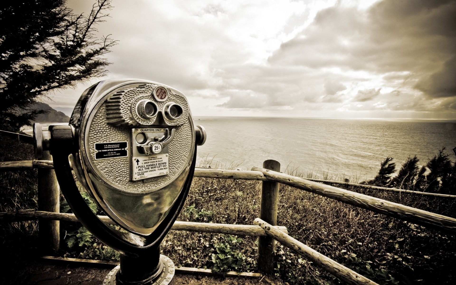 Foto monocromatica del mare con binocolo alla recinzione - sfondo del desktop