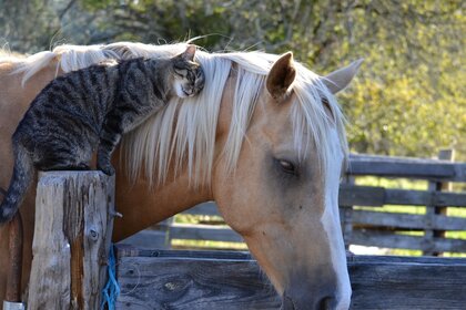 Gatto europeo che sfrega contro la criniera del cavallo