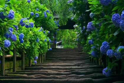 Scala in un cerchio di cespugli con fiori blu