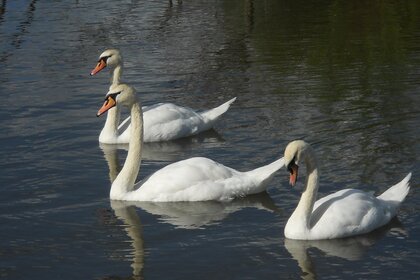 Tre cigni bianchi che nuotano sul lago