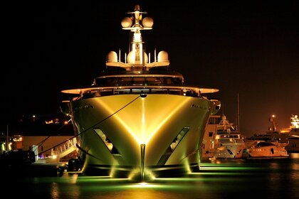Bella nave con luci nella baia