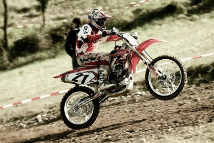 Motociclista sulla ruota posteriore in movimento