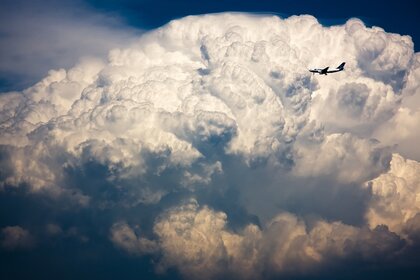 Piccolo aereo sullo sfondo di una nuvola enorme