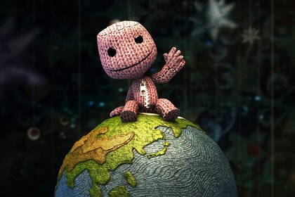 L'uomo lavorato a maglia si siede sul globo del cartone animato