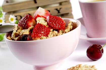 Deliziosi cereali con latte e fragole