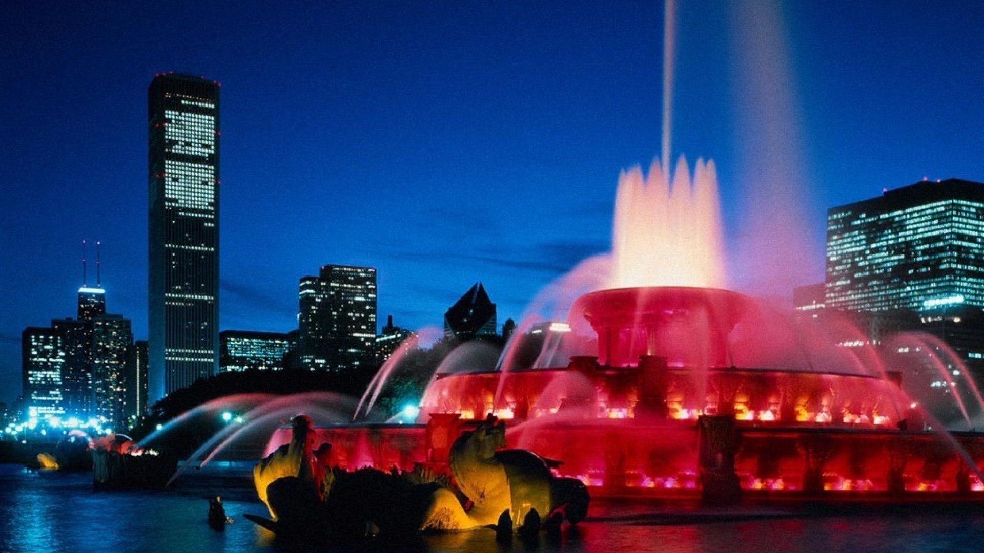 Luci della fontana della città tra i grattacieli - sfondo del telefono