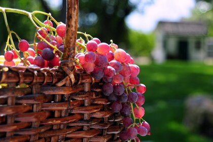 Grappolo di uva lilla in un cesto di legno